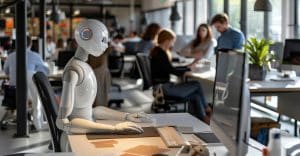 Artificial intelligence tools and robots integrating seamlessly into human workflows in a contemporary office setting.